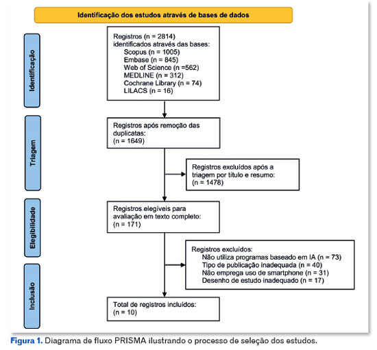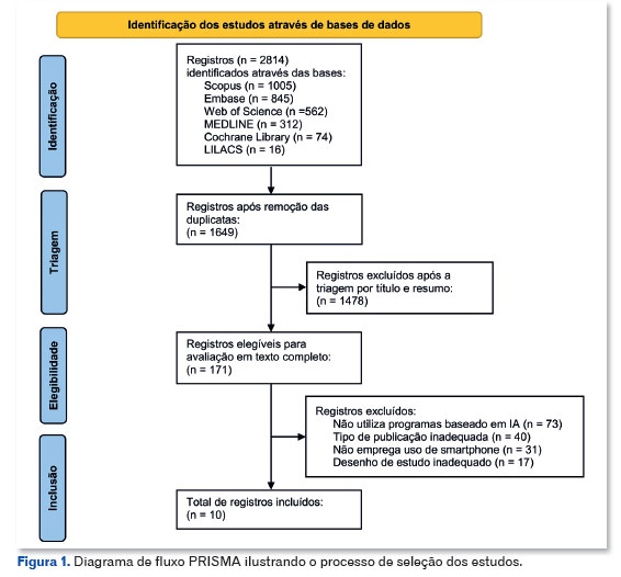 Uma busca sistemática foi realizada em seis bases de dados (Scopus, Embase, Web of Science, MEDLINE, Cochrane Library e LILACS), identificando inicialmente 2.814 registros potencialmente relevantes para o processo de triagem. Após a remoção de 1.165 artigos duplicados, 1.649 exclusivos foram retidos. Desses, 1.478 foram excluídos na triagem por título e resumo. Os 171 artigos restantes foram avaliados em sua totalidade, dos quais 161 artigos foram removidos por não atenderem aos critérios de inclusão. Assim, 10 estudos foram incluídos na meta-análise final9,15-23. O processo de seleção de artigos foi ilustrado na Figura 1, seguindo o formato do diagrama de fluxo PRISMA.