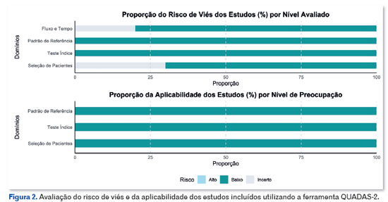 A qualidade metodológica dos estudos incluídos foi feita ao utilizar a ferramenta Quality Assessment of Diagnostic Accuracy Studies 2 (QUADAS-2)13, a qual analisa com base nos domínios de risco de viés e aplicabilidade dos achados, ao considerar os tópicos: Fluxo e tempo, padrão de referência, teste índice e seleção de pacientes.