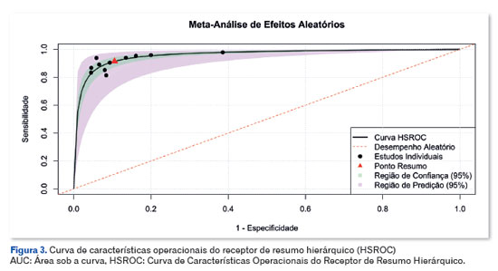 A análise estatística foi conduzida por meio do software RStudio (Versão: 4.4.2) a partir do uso de um modelo de meta-análise bivariada de efeitos aleatórios para avaliar a sensibilidade e a especificidade em conjunto. A heterogeneidade foi avaliada por I2 adapatado para o modelo bivariado, conforme proposto por Zhou e Dendukuri14. Os efeitos fixos (sensibilidade e especificidade) foram considerados na análise, assim como o valor da correlação entre eles, além da a Razão de Verossimilhança Positiva (LR+) e Negativa (LR-).