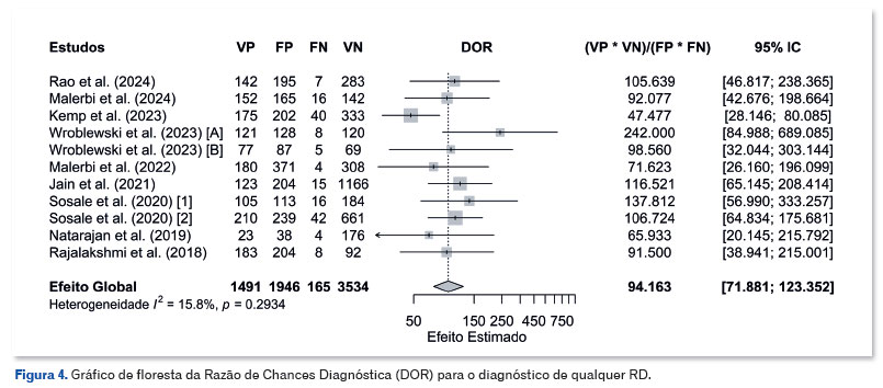 Os valores da análise da Razão de Chances Diagnóstica (DOR), estimados pelo modelo de efeitos aleatórios, foi de 94,16 [IC 95%: 71,88–123,35], indicando uma alta capacidade discriminativa do teste diagnóstico. A heterogeneidade entre os estudos foi considerada baixa, com I2=15,8% e teste Q com p=0,2934 sugerindo ausência de variabilidade substancial entre os estudos incluídos na análise (Figura 4).