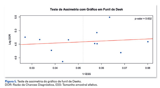 O viés de publicação foi avaliado por meio do Teste de assimetria do gráfico de funil de Deeks, específico para metanálises bivariadas de acurácia diagnóstica. Os valores de p<0,1 foram considerados indicativos de viés de publicação.