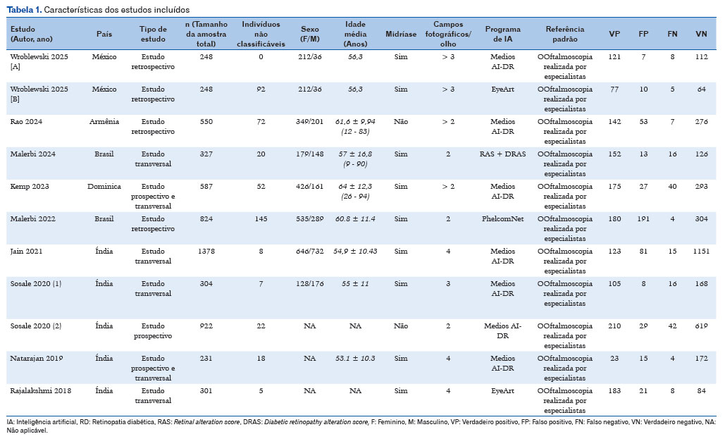 Foram extraídas informações relativas às principais características metodológicas e clínicas dos estudos selecionados, incluindo: nome do estudo (autor e ano), país de realização, tipo de estudo, tamanho da amostra total (n), número de indivíduos não classificáveis, distribuição por sexo (feminino/masculino), idade média dos participantes (em anos), uso de midríase, número de campos fotográficos por olho, programa de inteligência artificial (IA) utilizado, padrão de referência adotado e os parâmetros diagnósticos (verdadeiros positivos – VP, falsos positivos – FP, falsos negativos – FN e verdadeiros negativos – VN).