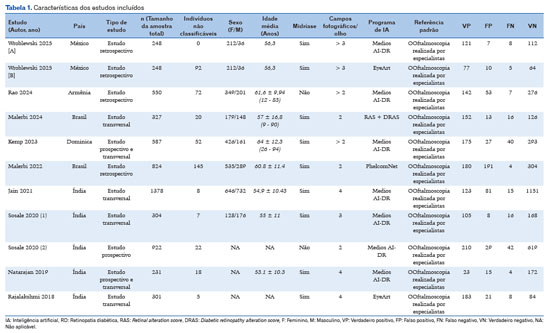 Os programas de inteligência artificial avaliados nos estudos incluíram diferentes algoritmos e softwares, como Medios AI-DR, EyeArt, PhelcomNet e RAS + DRAS. A avaliação de referência em todos os estudos foi realizada por um classificador humano.