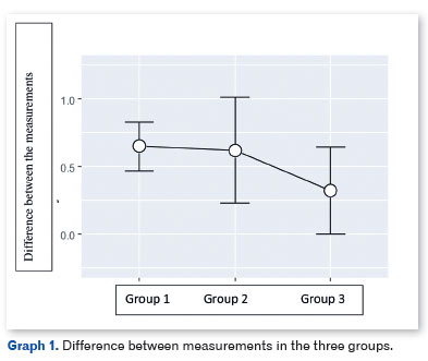 Graph 1 shows the differences between the two measurements in the three groups. There was no difference between the groups regarding the change between measurements 1 and 2 (F=1.46; p=0.24; η2=0.021).