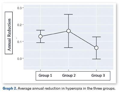 Graph 2 shows the average annual reduction in hyperopia in the three groups. There was no difference between the groups in terms of annual reduction in hyperopia (F=2.06; p=0.13; η2=0.030).