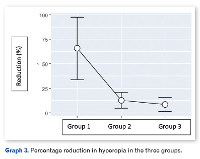 Graph 3 shows the percentage reduction in hyperopia in the three study groups. There was a significant difference between the groups in the percentage reduction in hyperopia (F=4.62; p=0.011; η2=0.065).