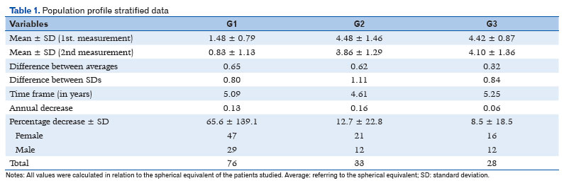 METHODS: The medical records of patients were analyzed and divided into three groups according to the optical correction used and the spherical equivalent.