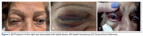A 78-year-old Caucasian woman with a history of systemic arterial hypertension presented to the ophthalmology department complaining of pain, redness, and blepharoptosis in her right eye (OD) for the past 10 days. She reported severe headache associated with tinnitus, more pronounced in the right ear. She denied any history of trauma or previous surgery. An anterior cranial CT scan was considered normal.