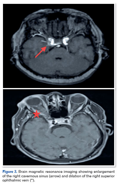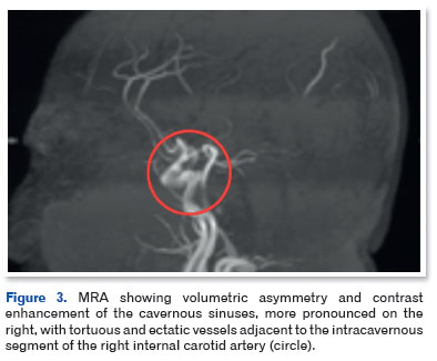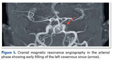 Clinically, direct CCFs cause an abrupt rise in orbital venous pressure, resulting in proptosis, chemosis, conjunctival congestion, pulsatile bruits, and paralysis of the III, IV, and VI cranial nerves. Dandy’s triad (proptosis, orbital bruit, and conjunctival congestion) is highly suggestive4. Digital cerebral angiography is the gold-standard diagnostic examination; however, other imaging tests, such as magnetic resonance angiography (MRA), may demonstrate dilation of the superior ophthalmic vein and alterations in the cavernous sinus5.