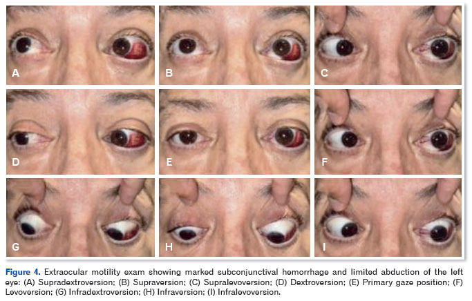Examination showed an off-center Hirschberg reflex, and the prism cover test demonstrated 20 prism diopters of esotropia at distance. Duction and version testing revealed hypofunction of the left lateral rectus muscle (grade +3), consistent with abducens nerve palsy (Figure 4). BCVA was 20/25 in OU. Ectoscopy revealed proptosis of the OS with palpable fremitus. Hertel exophthalmometry measurements were 17 mm in OD and 20 mm in OS, with >2 mm asymmetry indicating proptosis.