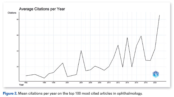 Figure 2 shows the trend of average annual citations for the top 100 articles—that is, the number of citations received per year on average since publication. This metric assesses impact adjusted for time, identifying which publications maintain continued high relevance. Between 1992 and 1998, annual average citations remained low (generally below 10 per year). From 1999, a gradual increase in this index is observed, with fluctuations but an overall upward trajectory. Pronounced peaks are seen in 2004, 2012, 2014 and 2017, years in which articles with exceptionally high citation rates were published. The highest peak of average annual citations occurs around 2021. In summary, this temporal impact analysis suggests that while older classic works continue to be cited, many of the most influential articles have emerged in recent years and are achieving high annual citation rates, reflecting current topics of great interest in ophthalmology.
