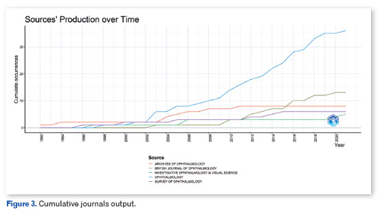 In addition to the raw article count, it is relevant to examine how these journals’ output evolved over time. Figure 3 illustrates the cumulative production of articles (among the top 100) by five key journals from 1992 to 2020: Ophthalmology, Archives of Ophthalmology, IOVS, British Journal of Ophthalmology, and Survey of Ophthalmology. Ophthalmology (blue line) consistently led contributions over recent decades, with a marked increase in cumulative articles especially after 2005. By 2018, Ophthalmology surpassed 30 articles published among the top 100, evidencing its central role in disseminating the most influential research. Archives of Ophthalmology (red line) saw a notable rise from the mid-2000s, and the British Journal (yellow line) shows a slight increase in the late 2010s. This analysis reinforces that Ophthalmology not only published the greatest number of influential works but also consolidated its dominance over time. While the other leading journals are important, their roles have been more modest and gradual. These patterns highlight the importance of specific journals as preferred vehicles for high-impact systematic reviews/meta-analyses in ophthalmology, possibly due to the broad reach and credibility these outlets offer.