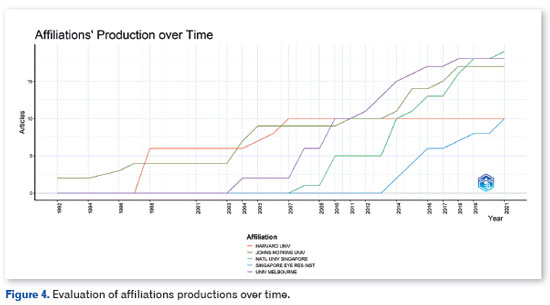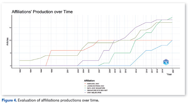 Figure 4 shows the temporal evolution of the leading institutions’ output from 1992 to 2021. Harvard University (red line) presented continuous and growing contributions, with an increase in articles starting in the mid-2000s, reaching a peak of about 10 accumulated articles by 2007, then it practically stalls. Johns Hopkins University (golden - yellow line) shows an increasing growth since 2003, reaching around 16 accumulated articles by 2018. The trajectory of the National University of Singapore (green line) and Singapore Eye Research Institute (blue line) displayed sharp growth from 2013/2014, reflecting Singapore’s rapid rise in global ophthalmology, leading the global high-impact contributions. The University of Melbourne (purple line) had a slower start with few articles in the 1990s and 2000s but shows acceleration from 2007, increasing its high-impact publication count near the end of the 2010s.