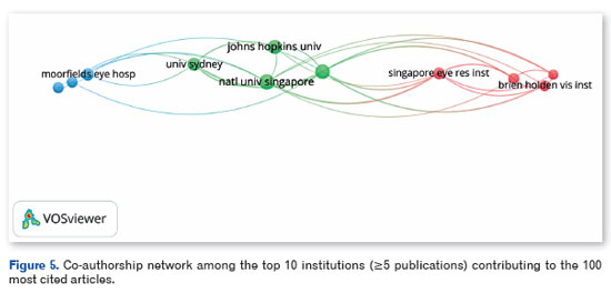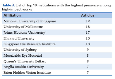 The 100 evaluated articles involve authors affiliated with a total of 365 institutions (universities, hospitals, or research centers). Table 3 lists the 10 institutions with the highest presence among high-impact works, measured by the number of top 100 articles in which each institution was represented by at least one author. Institutions from Asia, Oceania, and North America dominate this ranking. The National University of Singapore (NUS) leads the list, participating in 19 of the top 100 most cited articles, followed closely by the University of Melbourne (Australia) with 18 articles and Johns Hopkins University (United States of America - USA) with 17. Harvard University (USA) and the Singapore Eye Research Institute (SERI) each contributed 10 articles. Other notable institutions include the University of Sydney (Australia) with 9 articles, Moorfields Eye Hospital/Institute of Ophthalmology (UK) with 8, Queen’s University Belfast (UK) also with 8, and both Anglia Ruskin University (UK) and Brien Holden Vision Institute (Australia) with 7 articles each.