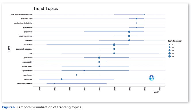 Furthermore, terms like “prevalence” and “maculopathy” (especially associated with age-related macular degeneration) appear regularly during the central portion of the timeline, suggesting continued focus on prevalence studies of ocular diseases and their visual consequences. In more recent years (approximately 2016–2020), new topics emerge such as “choroidal neovascularization” (typical of exudative macular degeneration), “refractive error” (including myopia), and “randomized clinical trial.”