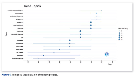 In summary, thematic evolution reflects a shift from classic pathophysiological factors (e.g., intraocular pressure in glaucoma) to a broader population health approach (blindness, risk factors, prevalence), and more recently, toward therapeutic and methodological advances (new interventions evaluated through RCTs). This trend analysis confirms that highly influential ophthalmological research has adapted to emerging challenges in the field, incorporating increasingly important themes such as global blindness, retinal neovascular diseases, and evidence-based medicine via rigorous clinical trials.