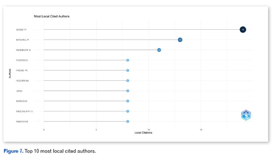 These local citation data (summarized in Figure 7) suggest interconnectivity among the top 100 articles: authors such as Wong, Mitchell, and Resnikoff produce foundational studies that serve as conceptual or methodological bases for others, forming a highly referenced literature core. In summary, the author analysis reveals both the key scientific leaders in ophthalmology, whose research volume and global impact are extraordinary, and the network of mutual influence among these high-impact studies, reinforcing the cumulative and collaborative nature of scientific advancement in the field.