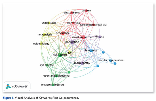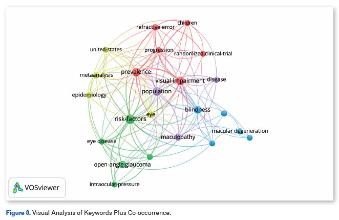 The most frequent terms summarize the primary thematic focuses of the top-cited articles. Broadly, they cluster into three areas: ocular epidemiology, prevalent eye diseases, and methods/interventions. In the ocular epidemiology and global vision health cluster, prominent keywords include “blindness,” “visual impairment,” “prevalence,” “population,” and “risk factors.” These reflect a strong emphasis on disease burden and population-level studies among top-cited works, many of which explore prevalence, risk factors, and visual loss impacts across populations.