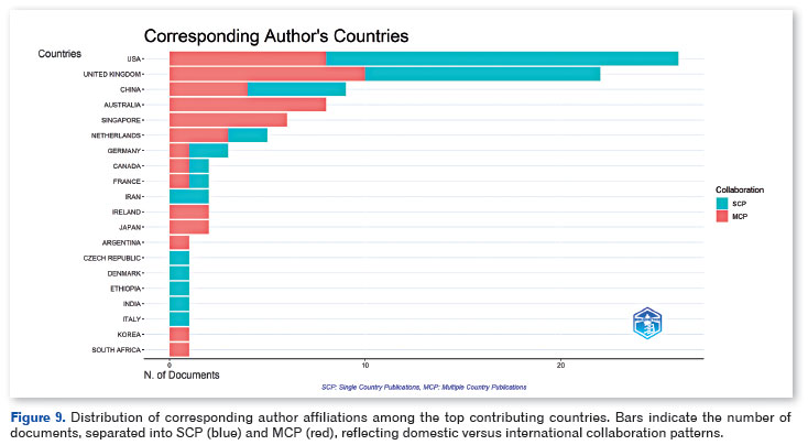 Figure 9 complements these findings by visually presenting the distribution of SCPs and MCPs among the top contributing countries. It reinforces the central role of high-income nations, especially the US and UK, not only in terms of volume but also in terms of collaboration profiles. While the US dominates in total output, countries like Singapore, Australia, and the Netherlands stand out for their strategic integration into international research networks, evidencing the importance of global cooperation in shaping contemporary ophthalmological science.