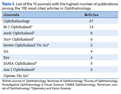 The journal Ophthalmology stands out as the main outlet, publishing 37 of the 100 most cited articles, representing 37% of all works in this ranking. Next, the British Journal of Ophthalmology published 13 articles from the top 100, and Archives of Ophthalmology contributed 8 articles. Notably, the Archives of Ophthalmology ceased publication under this name in 2013 and was rebranded as JAMA Ophthalmology, which continues to publish under the same editorial lineage.