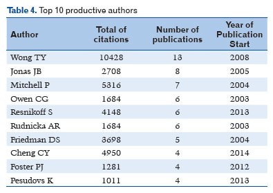 A total of 658 authors contributed to the 100 most cited articles in ophthalmology. Table 4 highlights the 10 most productive authors, along with their total citations and the year of their first publication in the dataset. High-impact ophthalmological research is, in part, driven by a group of prolific and influential authors.