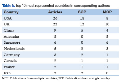 A particularly relevant aspect revealed in this analysis is the variation in international collaboration, measured through the distinction between SCP (Single-country publications) and MCP (Multiple-countries publications). Countries with lower overall output often show a higher proportion of internationally co-authored articles. For instance, both Australia and Singapore had 100% of their articles as MCPs, indicating that all their high-impact studies were developed through international collaborations, likely via research consortia or multinational epidemiological initiatives. The Netherlands also had a notable share of MCPs (60%), while Canada and France each had 50%. This suggests that researchers from these countries frequently seek international partnerships to enhance their scientific visibility and impact.