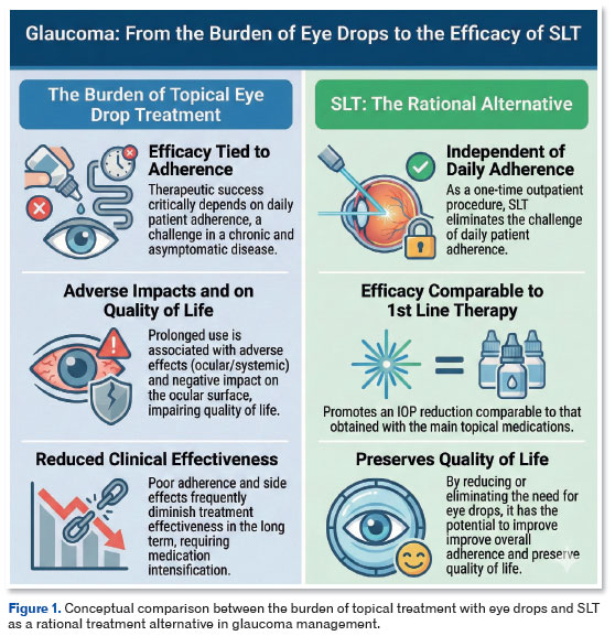 In this regard, selective laser trabeculoplasty (SLT) has emerged as an effective alternative to topical treatment, and SLT promotes an IOP reduction similar to first-line medications through a single outpatient procedure that is safe and does not require daily adherence. By reducing or eliminating the need for eye drops, SLT has the potential to improve overall adherence to treatment and preserve health-related quality of life. Thus, the comparison between SLT and eye drops is important not only for the magnitude of the pressure reduction but also for its functional, behavioral, and patient-centered effects (Figure 1)3,5-7.