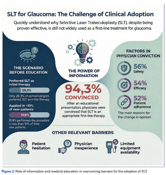 Thus, the expansion of the use of SLT in clinical practice depends fundamentally on: strengthening the training of ophthalmologists (especially of general ophthalmologists), including training in communicating clearly and in a balanced way with patients about the advantages and limitations of the procedure, gaining practical experience with the technique, and increasing the availability of the equipment in both public and private networks (Figure 2).