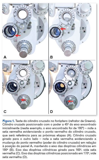 Após determinar o poder da DC, é necessário refinar o eixo do cilindro (caso a AV do paciente seja ≤ 20/200, recomenda-se o uso do cilindro cruzado de ±1.00 DC). Para isso, o paciente deve olhar para os optotipos que estão localizados duas linhas acima da menor linha na tabela de AV que ele consiga identificar os optotipos (ex: se a menor linha que o paciente consegue ver é a 20/30, pedir para ele olhar duas linhas acima, ou seja, linha 20/50), orientando-o a focalizar em uma letra de contornos arredondados. Em seguida, o examinador deve posicionar o cilindro cruzado de modo que o seu poder esteja a 45º do eixo encontrado inicialmente (por meio da refração objetiva ou por meio do item 3.6.1) e informar que a visão deverá ficar um pouco mais embaçada durante este teste. Realizar o teste do cilindro cruzado (girando a lente de um lado para o outro – Figura 1A e B) fazendo o seguinte questionamento (ou similar): “Qual lente é melhor: a primeira, a segunda, ou as duas lentes estão semelhantes?”.