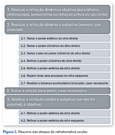 Na literatura pesquisada há escassez de informações com sugestão de fluxo para realização da RO, inclusive em livros textos que tratam do tema. Após análise das informações coletadas, elaboramos um passo a passo para o exame de refração4,9-14: