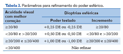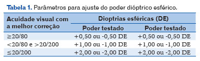 Nota: Durante o teste, caso o paciente melhore a AV, deve ser testado o poder esférico com lentes de dioptrias correspondentes à nova categoria alcançada (Tabela 1).