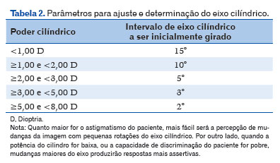 3.7.1 Se o paciente preferir uma posição do cilindro cruzado a outra (ex: se o paciente responder que prefere a primeira lente ao invés da segunda), quando o equipamento em uso for um foróptero de cilindro negativo (mais comum no Brasil), o eixo da lente cilíndrica deve ser girado em direção ao eixo negativo do cilindro cruzado (marcado pelo ponto vermelho no foróptero) de acordo com a quantidade sugerida na tabela 2. Em seguida, deve-se repetir o item 3.7 até que o paciente responda que ambas as lentes estão semelhantes, reduzindo o intervalo de eixo cilíndrico a ser girado quando inversão do sentido de rotação do cilindro cruzado. Exemplo: se um paciente com - 0,75 DC a 180º optar inicialmente pela lente que determina um giro do cilindro cruzado no sentido horário (Figura 1A), deve-se girar 15º no sentido horário, colocando - 0,75 DC a 165º (Figura 1C); porém, se ao realizar novamente o teste do cilindro cruzado com a lente de - 0,75 DC a 165º o paciente preferir a lente que determina um giro do cilindro cruzado no sentido anti-horário, o cilindro cruzado deve ser girado 5º no sentido anti-horário e o novo grau a ser testado será - 0,75 DC a 170º (Figura 1D), continuando até que o paciente informe que “as duas lentes são semelhantes”. O eixo deverá estar na posição exata quando o paciente informar que ambas as lentes estão semelhantes.