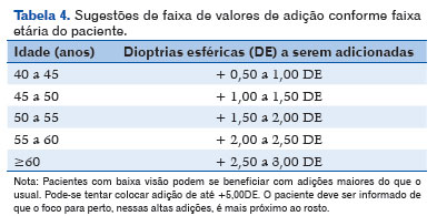 Etapa realizada em présbitas, em olhos que tenham sido submetidos a facectomia e em outras situações a critério do Oftalmologista. Caso o paciente não se enquadre nestes critérios, deve-se prosseguir para a avaliação da refração estática (item 4). A medida do erro refrativo para obtenção de uma melhor AV para perto pode ser realizada simultaneamente em AO sem oclusão ou com cada olho individualmente, a critério do Oftalmologista. Deve ser avaliada a capacidade do paciente em focar a imagem para uma distância de perto (35-40 cm) adicionado o mínimo de lentes positivas para que ele obtenha a melhor AV possível com uma tabela de AV para perto. Sugere-se o uso da tabela de Jaeger nesta etapa. A tabela 4 expõe sugestões de faixa de valores de adição de DE positivas, conforme faixa etária. Em olhos submetidos a face ctomia deve ser considerada a adição de +2,50 a +3,00 DE. Cabe ao Oftalmologista a determinação do poder dióptrico a ser utilizado para adição em casos de outros distúrbios da acomodação seguindo as recomendações descritas na literatura. Destaca-se que pode haver diferença na capacidade acomodativa (amplitude de acomodação) de cada olho. Um método simples para a aferição da capacidade acomodativa é, em uso da correção identificada para longe, pedir para o paciente olhar para a segunda linha do cartão de leitura de Jaeger (J2). Move-se a tabela lentamente em direção ao olho até que o paciente relate borramento dos optotipos. Quando ocorre um borramento apenas levemente perceptível, o cartão é movido para mais próximo do paciente para confirmar que ele está piorando e, então, o cartão é movido para mais distante do paciente até que ele melhore e mede-se a distância entre a tabela e a lente que o paciente está utilizando. A amplitude de acomodação (AA) é então obtida por meio da fórmula AA (em dioptrias) = 1/distância da tabela até a lente (em metros). Exemplo: se a distância que o paciente referiu borramento for 10cm, a amplitude de acomodação será 1/0,1 (ou seja, 10 dioptrias).