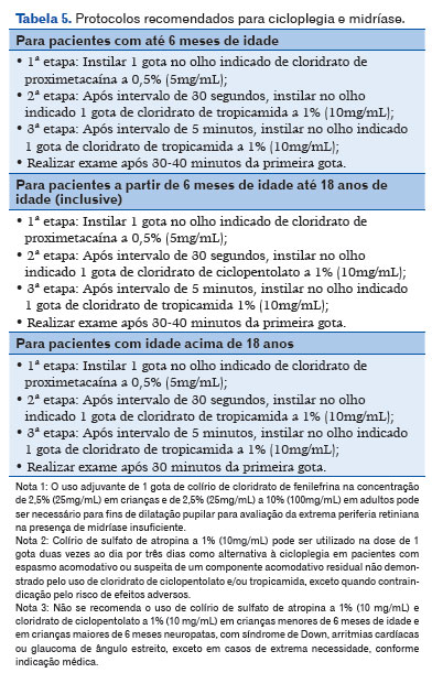 Para esta etapa, faz-se necessário o uso de colírios cicloplégicos e que se aguarde o tempo de ação deste(s). O paciente e/ou responsável deve ser informado sobre os possíveis efeitos colaterais. Ressalta-se a importância da compressão do saco lacrimal imediatamente após a instilação de colírios a fim de diminuir a possibilidade de efeitos sistêmicos e aumentar o tempo de atuação dos colírios no olho, especialmente em crianças e adultos com comorbidades. Tendo em vista a necessidade de uso de medicamentos durante o exame de refração, tal prática deve ser sempre monitorada pelo Oftalmologista. Ressalta-se que, dependendo das características clínicas de cada paciente e suspeitas diagnósticas, poderá ser necessário o uso de outros colírios cicloplégicos e midriáticos, a critério médico. Para fins de cicloplegia, recomenda-se o uso de colírios conforme descrição na Tabela 54,9,15-17.