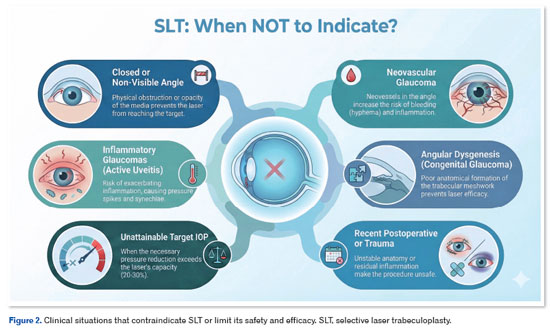 With regard to contraindications, it is essential to understand that the efficacy of SLT depends directly on its ability to remodel and increase the permeability of the trabecular meshwork. Therefore, in clinical situations where resistance to aqueous humor outflow is caused by pre-trabecular alterations (such as a closed iridocorneal angle, inflammatory or neovascular membranes covering the angle) or by post-trabecular alterations (such as increased episcleral venous pressure), the laser tends to have no effect. In addition to this pathophysiological limitation, contraindications are based on the inability to visualize the target structures or the presence of conditions that may be aggravated by the inflammatory mechanism of the procedure (Figure 2).