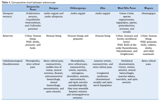 Keywords: Chikungunya; Dengue; Ophthalmological manifestations; Mayaro Fever; Oropuche fever; West Nile fever; Zika; Zoonoses.