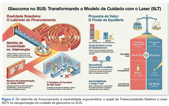No entanto, enfrentamos uma barreira de implementação complexa: a arquitetura de financiamento. Atualmente, o Programa de Glaucoma do SUS privilegia o tratamento medicamentoso. O sistema é eficiente em fornecer o frasco na "Farmácia de Alto Custo", mas não possui um fluxo desenhado para oferecer o laser como porta de entrada16. Não existe codificação exclusiva para a SLT na Tabela SIGTAP. A prática vigente depende de códigos inespecíficos com repasses incompatíveis com o custo operacional do equipamento, gerando um subfinanciamento que desincentiva a adoção da tecnologia pelos serviços especializados.
