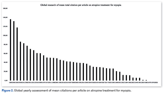 Figure 2 illustrates the global yearly assessment of mean citations per article on atropine treatment for myopia.
