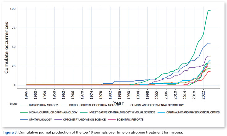 In the top 10 journals, the Journal Investigative Ophthalmology & Visual Science has published articles (98), followed by Ophthalmology with (55) articles; Optometry and Vision Science has contributed (38) articles, while Ophthalmic and Physiological Optics published (33); British Journal of Ophthalmology and Indian Journal of Ophthalmology both featured (29) articles each; Scientific Reports released (25) articles and Clinical and Experimental Optometry published (22); BMC Ophthalmology followed with (18) articles and JAMA Ophthalmology contributed (17) articles to the field. Figure 3 illustrates the cumulative journal production of the top 10 journals on atropine treatment for myopia over time.
