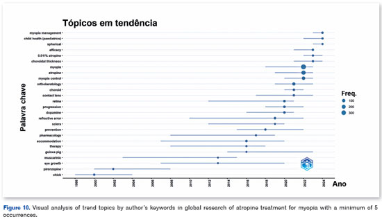 Regarding the occurrence of keywords and trend topics, terms such as "atropine", "prevalence", "children", "progression", and "efficacy" stood out as the most frequent. This pattern reflects the predominant focus of current research, highlighting a scientific priority to better understand the effects of atropine in managing ophthalmological conditions, such as myopia. The recurrent presence of the word "children" suggests a particular interest in the impact of atropine on the pediatric population, which is considered especially vulnerable to myopia progression. Some studies have suggested favourable outcomes in reducing myopia progression following the use of atropine, further emphasizing its potential as an effective intervention in this age group30,31. Additionally, the use of terms such as "prevalence" and "progression" appears as relevant trend topics, demonstrating a concern with assessing the magnitude of the problem and the effectiveness of the intervention over time.