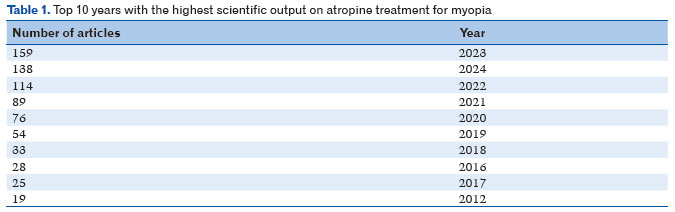 This is the first study to evaluate the bibliometric characteristics of global scientific production on atropine treatment for myopia in the WoS database up to January 9th, 2025. The analysis revealed the following findings: a total of 936 articles published on the use of atropine for myopia, with China being the leading contributor, accounting for 34.7% (n= 325) of these publications, reflecting the recent increase in research output since 2017; the most cited author was Morgan IG "The epidemics of myopia: A etiology and prevention"3 was the most cited paper with 708 citations; the top three journals with the highest number of publications were Investigative Ophthalmology & Visual Science, Ophthalmology and Optometry and Vision Science, all from the USA and the authors with most publications was Schaeffel F and Yam JC, with each of them contributing with 22 works.