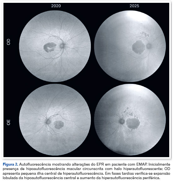 O acompanhamento multimodal permitiu documentar objetivamente as alterações estruturais e funcionais da retina e mácula desde fases iniciais, evidenciando a progressão do acometimento retiniano até a atrofia coriorretiniana. O padrão de disfunção ampla de bastonetes e cones observado no ERG CT associado ao comprometimento macular de cones no mf ERG reforça o entendimento do EMAP como uma doença difusa da retina.