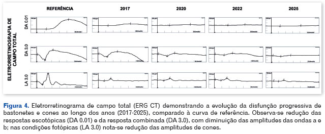 Os exames eletrofisiológicos mostraram gradativa deterioração da função global de bastonetes e cones no ERG CT (Figura 4) e piora da função macular de cones no ERG mf (Figura 5).