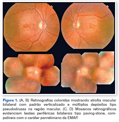 A atrofia macular extensa com pseudodrusas (EMAP) é uma maculopatia rara, caracterizada por atrofia coriorretiniana bilateral, simétrica e de progressão acelerada, com perda visual tipicamente entre a quinta e a sexta década de vida1,2. Clinicamente, manifesta-se por nictalopia, escotomas centrais e periféricos e redução progressiva da acuidade visual. À fundoscopia, observa-se envolvimento macular predominante no eixo vertical, com depósitos do tipo pseudodrusas que se estendem à média periferia3-5.