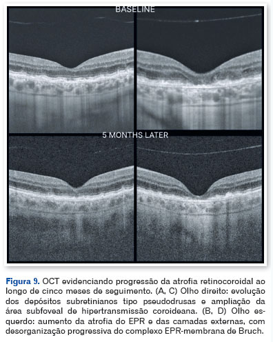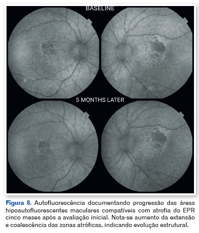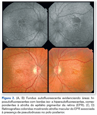 A tomografia de coerência óptica (OCT) mostrou pseudodrusas no polo posterior, separação focal entre o epitélio pigmentar da retina e a membrana de Bruch, além de áreas de atrofia macular. A autofluorescência evidenciou zonas hipoautofluorescentes bem delimitadas com bordas iso- a hiperautofluorescentes, compatíveis com perda do epitélio pigmentar da retina (Figuras 3, 4 e 5).
