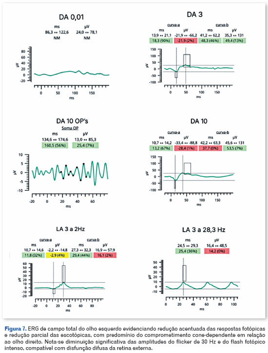 O eletrorretinograma de campo total demonstrou disfunção retiniana bilateral predominantemente cone-mediada, com redução difusa das amplitudes fotópicas e de flicker e preservação parcial das respostas bastonete-mistas, corroborando disfunção difusa da retina externa e o caráter neurodegenerativo da EMAP7,8.