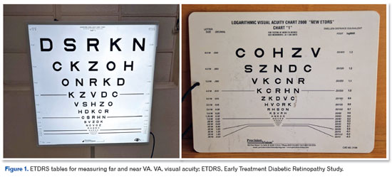The tables used for measuring must be appropriate for the individual's age, abilities, and level of understanding. The World Health Organization (2015) recommends using the Lea Hyvärinen (LH) table for illiterate people and the Early Treatment Diabetic Retinopathy Study (ETDRS) table for literate people. Teller cards can be used if the patient cannot respond to the other tests2. The finger count test should be avoided because it is not standardized (Figure 1).