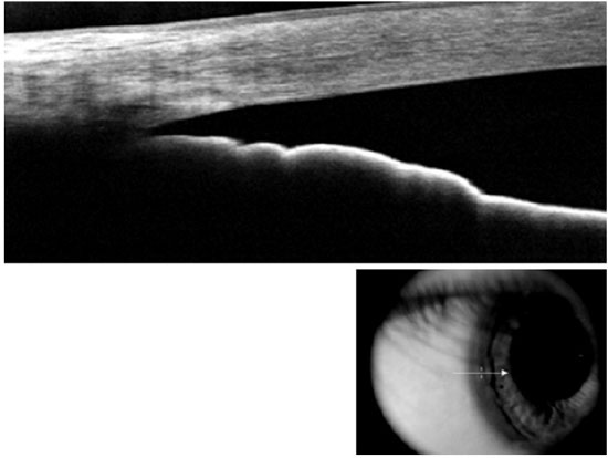 AS-OCT and some new UBM devices are able to image the entire cross section of the anterior segment in one image frame, which represents an interesting method for assessing and documenting the profile of the iris and its relationship to the other anatomical parameters of the eye. Another interesting parameter is the lens vault or lens rise, which is a measure of how anteriorly the anterior surface of the lens is located relative to a line joining scleral spur to scleral spur. Studies have reported that both the lens vault and iris curvature were independently associated with angle closure, as defined on gonioscopy examination. However, it is important to note that neither of these parameters alone should determine the clinical management decisions, as angle closure results from a combination of several anatomical features in each eye.