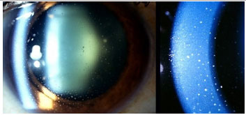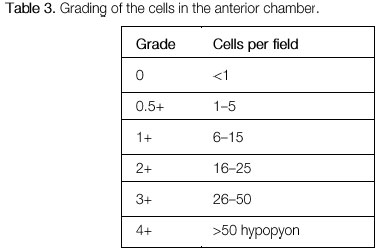 The activity of ocular inflammation can be measured based on the number of cells present in the anterior chamber. For this purpose, the light intensity of the slit-lamp is raised to the maximum using a 1 x 1 -mm slit, and the light beam is directed at a 45°-60° oblique angle on to the plane of the iris. (Table 3; Figures 3 and 4).