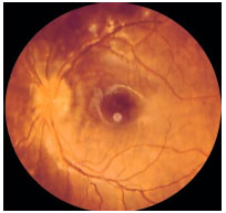 Serpiginous Choroiditis: This is a rare, chronic, bilateral posterior uveitis. It is progressive and recurrent, with months or years of inactivity between episodes. Its etiology is unknown. It typically affects middle-aged men. It is usually asymptomatic until the macula is affected. The eye is quiet, with no or minimal anterior chamber reaction, and the vitreous may exhibit fine pigmented cells. The active lesions present as grayish or yellowish subretinal infiltrates that extend outward and irregularly from the optic disc. Neovascularization of the choroid is the most common complication. This condition must be distinguished from ocular tuberculosis. Fluorescein angiography (FA): early hypofluorescence, with hyperfluorescence of the lesion margins that evolves centrally with gradual leakage in the late phase. The treatment includes local and systemic steroids. The use of immunosupressive agents is often necessary.